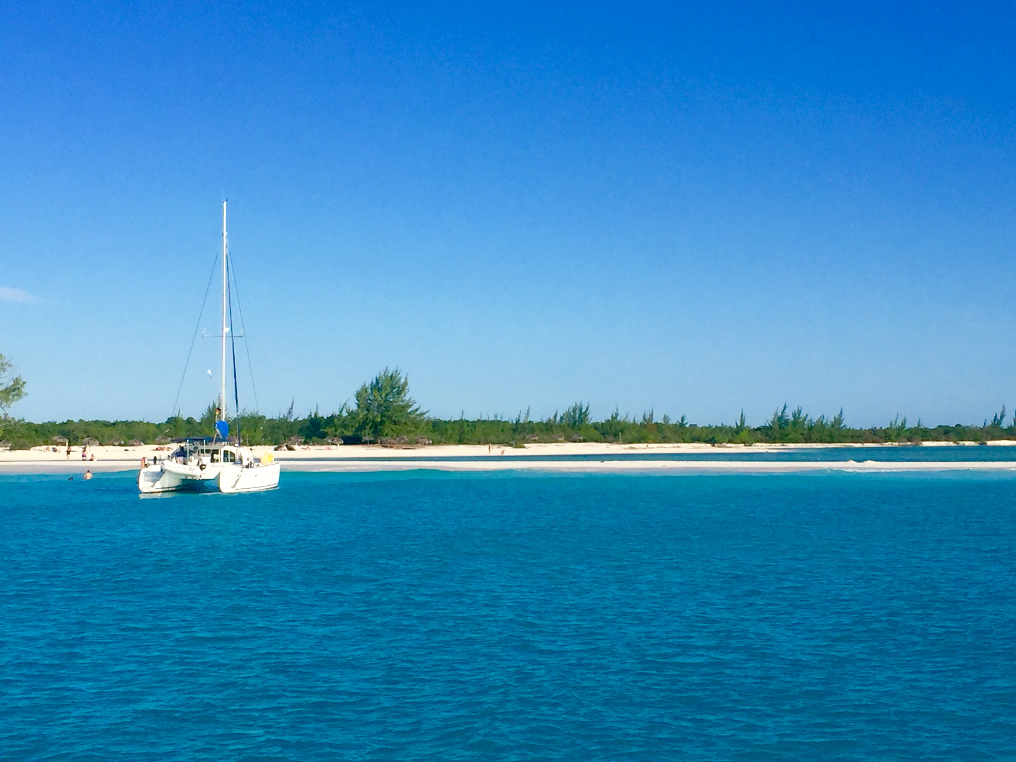 Nuestro objetivo hoy es Cayo Guano del este donde después de 40 millas llegamos poco a poco los 9 barcos. Allí encontramos fondeados 2 barcos de pescadores. Con el dinghy nos acercamos a hablar con ellos y preguntamos si tienen algún pescado rico. Nos dicen que tienen pargo y algunas langostas. Les traemos una botella de ron blanco y nos dan a cambio el pargo de 3 kilitos y 4 langostas , lo normal en cualquier lugar del Mediterráneo. También nos ofrecen hielo para enfriar bebida, no potable y con buen olor a pescado. Pero decidimos no llevarlo (el hielo, digo).